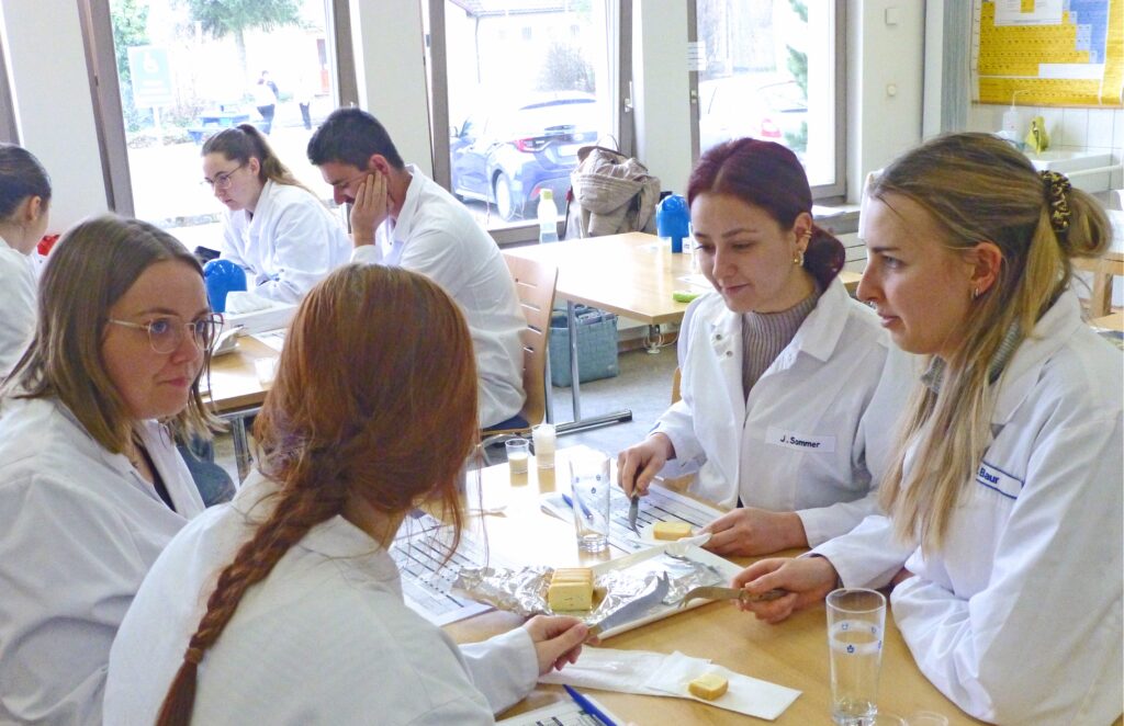 Am 25. Februar 2026 war es wieder so weit: die Studierenden wurden von den Sensorik-Spezialisten in die Welt der Grundgeschmacksarten, Qualitätskriterien und auch Produktfehler eingeführt. Der Genusswert von Milch und Milchprodukten ist für die Behauptung am Markt von wesentlicher Bedeutung. „Verbraucher reagieren immer empfindlicher auf sensorische Fehler“, so die einhellige Aussage der beiden Workshop-Leiter Rebekka Wucher (muva kempten GmbH) und Axel Hufnagl (DLG Testzentrum Lebensmittel). Mit dem erworbenen Expertenwissen können die Seminarteilnehmer künftig bei der sensorischen Beurteilung und Optimierung der Produkte im Molkereibetrieb punkten.